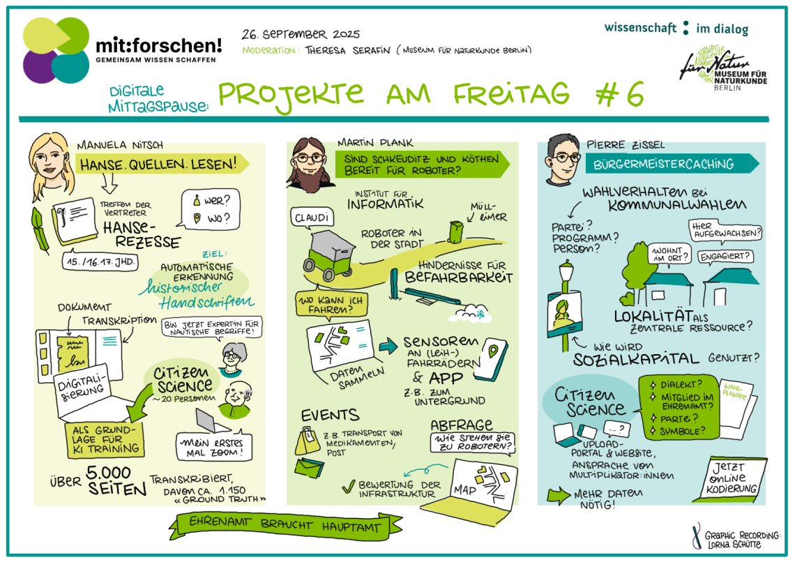 In unserer Ausgabe "Projekte am Freitag" am 26. September haben sich wieder drei erfolgreiche Citizen-Science-Projekte vorgestellt und aus ihrer Arbeit berichtet. Teilnehmende konnten die Projekte Hanse.Quellen.Lesen! (Referentin Manuela Nitsch), Sind Schkeuditz und Köthen bereit für Roboter? (Martin Plank) und Bürgermeistercaching (Pierre Zissel) kennenlernen und Fragen an die Projektverantworlichen stellen.